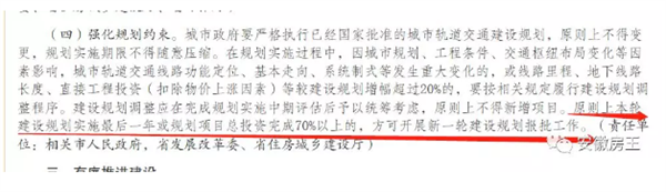 《实施意见》第四条规定:城市政府要严格执行已经国家批准的城市轨道交通建设规划,原则上不得变更,规划实施期限不得随意压缩。在规划实施过程中,因城市规划、工程条件、交通枢纽布局变化等因素影响,城市轨道交通线路功能定位、基本走向、系统制式等发生重大变化的,或线路里程、地下线路长度、直接工程投资(扣除物价上涨因素)等较建设规划增幅超过20%的,要按相关规定履行建设规划调整程序。建设规划调整应在完成规划实施中期评估后予以统筹考虑,原则上不得新增项目。原则上本轮建设规划实施最后一年或规划项目总投资完成70%以上的,方可开展新一轮建设规划报批工作。(责任单位:相关市人民政府,省发展改革委、省住房城乡建设厅)