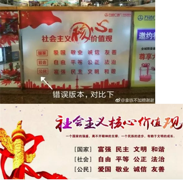 怎么说呢,颍州万达广场主动宣传社会主义核心价值观的态度固然可取,但一时的疏忽,却也贻笑大方了!